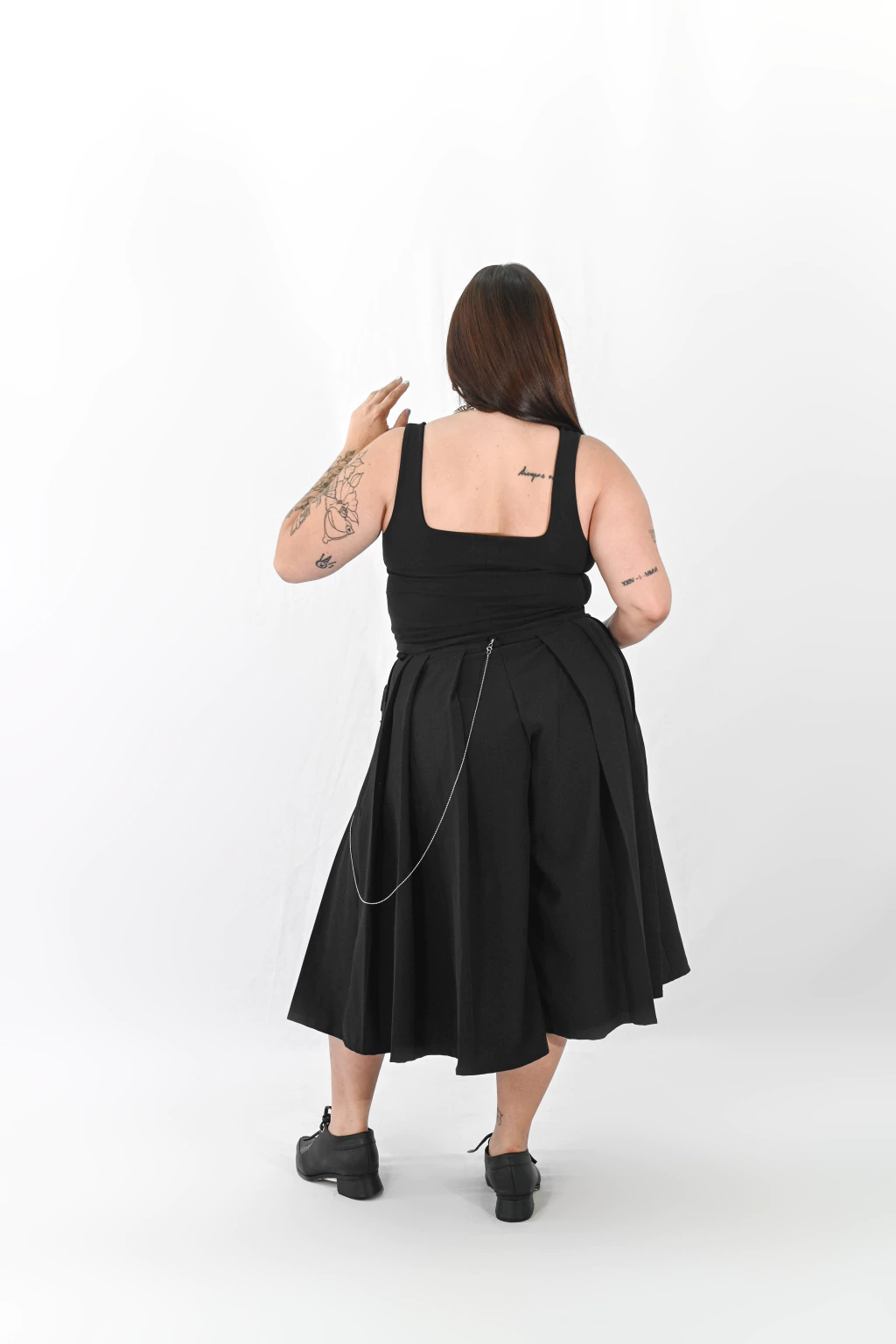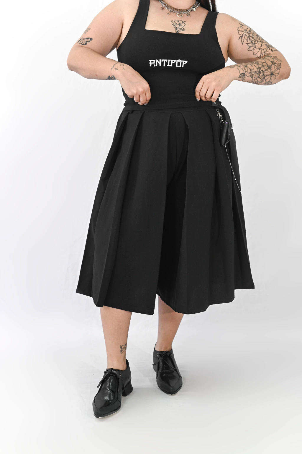 Bermuda inspirada en la hakama tableada con bolsillos laterales y elástico en el trasero confecciónada en crepe premium negro con pasacintos y portaencendedor de caucho reciclado con cadenita de Muta Accesorios,