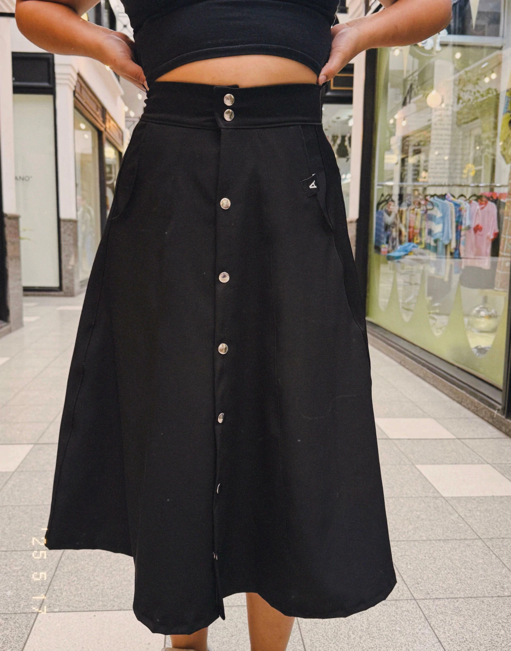Falda midi sastrera con bolsillos, broches frontales y cintura trasera con elástico confeccionada en gabardina TwoWay negra.
