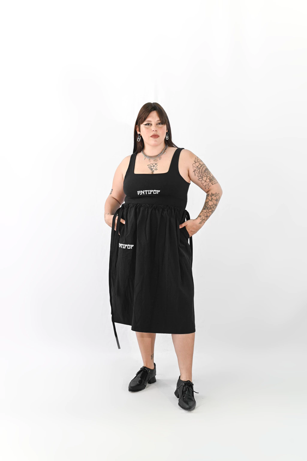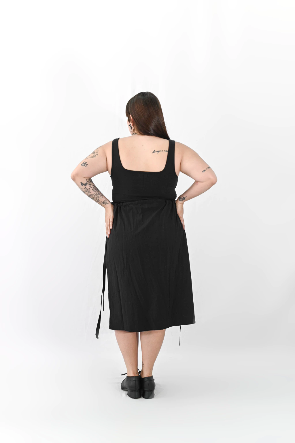 Falda midi confeccionada en parachute negro con tiras regulables en cintura, bolsillos laterales y detalle de bordado.
