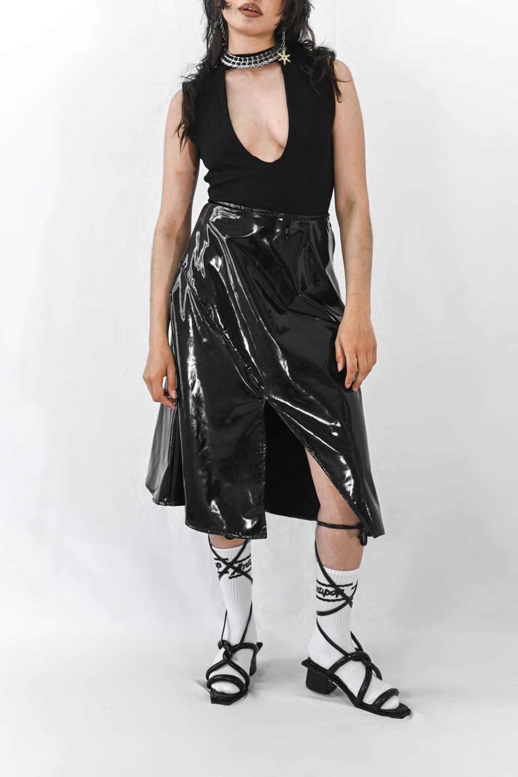 Falda midi irregular confeccionada en charol negro con cierre lateral.