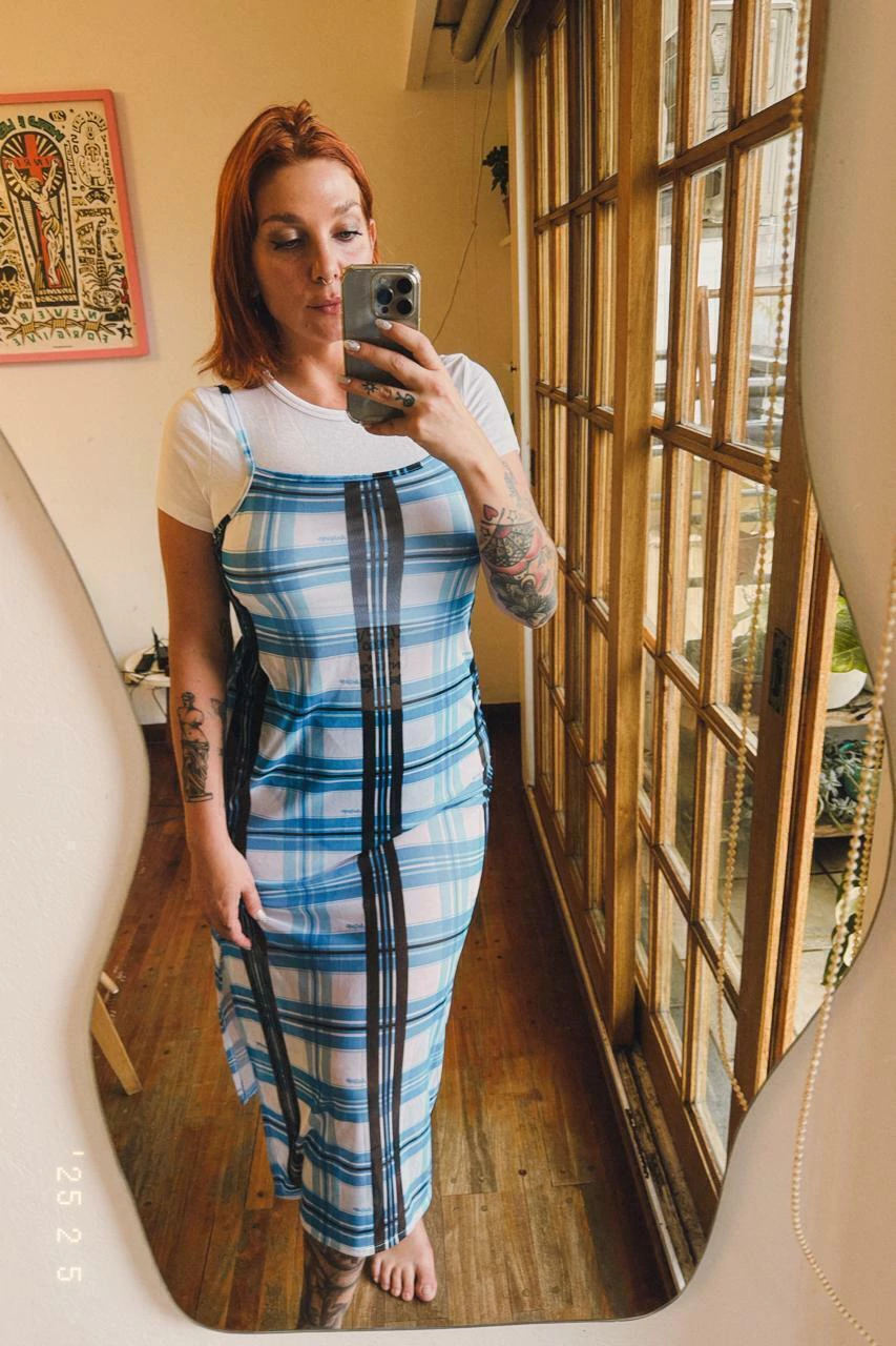 Vestido midi sin mangas con escote cuadrado, tiras regulables y tajo lateral confeccionado en microtul estampado.