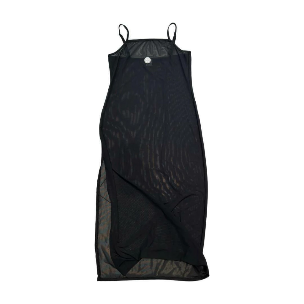 Vestido midi sin mangas con escote cuadrado, tiras regulables y tajo lateral confeccionado en microtul powernet negro con detalles de PVC en el delantero.