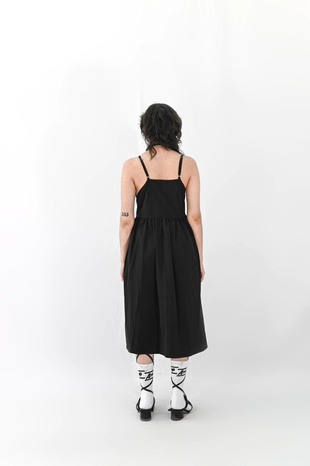 Vestido musculosa con tiras regulables y lazo confeccionado en parachute negro.